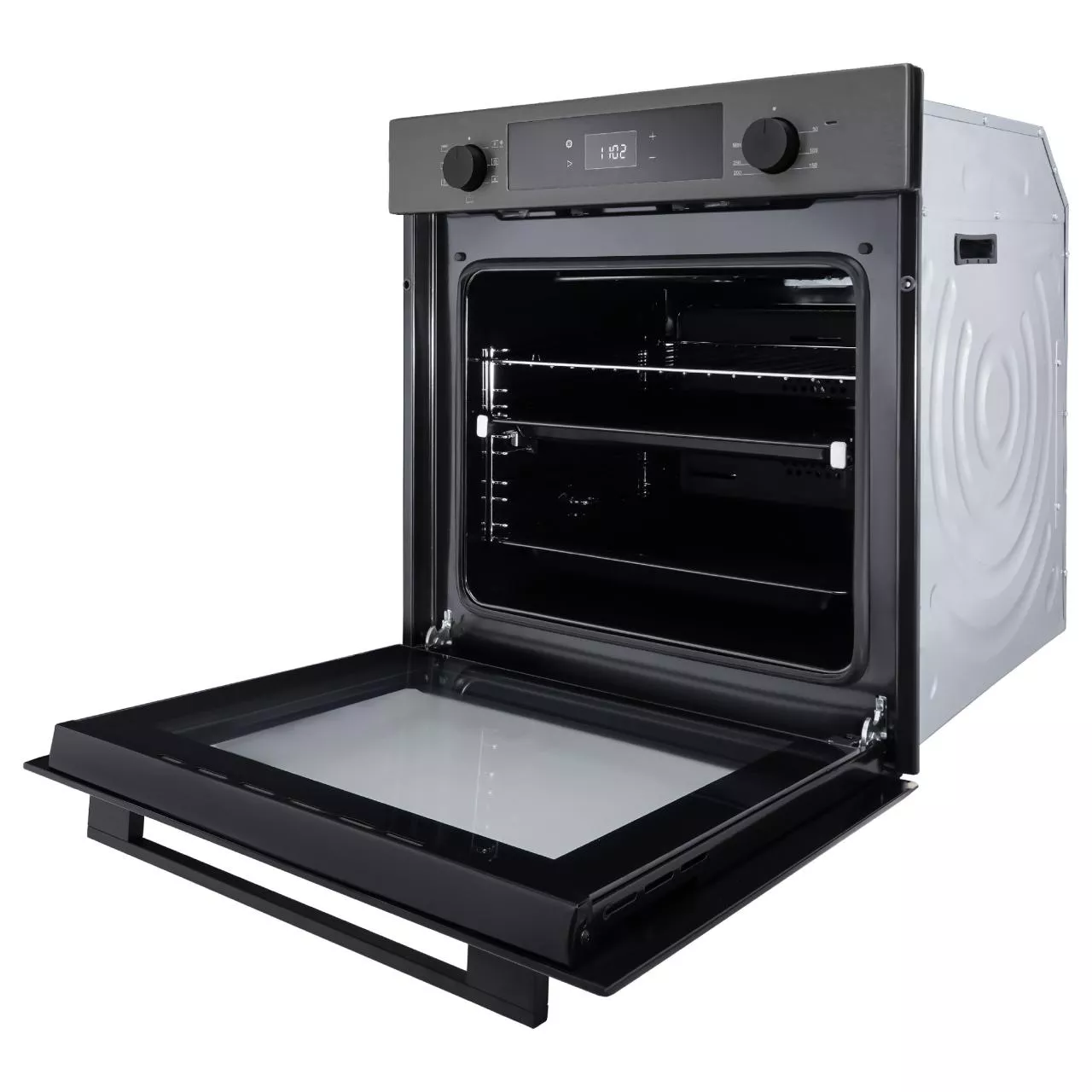 Управление осуществляется с помощью утапливаемых переключателей и сенсорного программатора, что делает процесс приготовления еды удобным и простым. Освещение духового шкафа осуществляется галогенной лампой, которая обеспечивает яркий и четкий свет. Оснащен дисплеем, который позволяет легко управлять всеми функциями устройства.