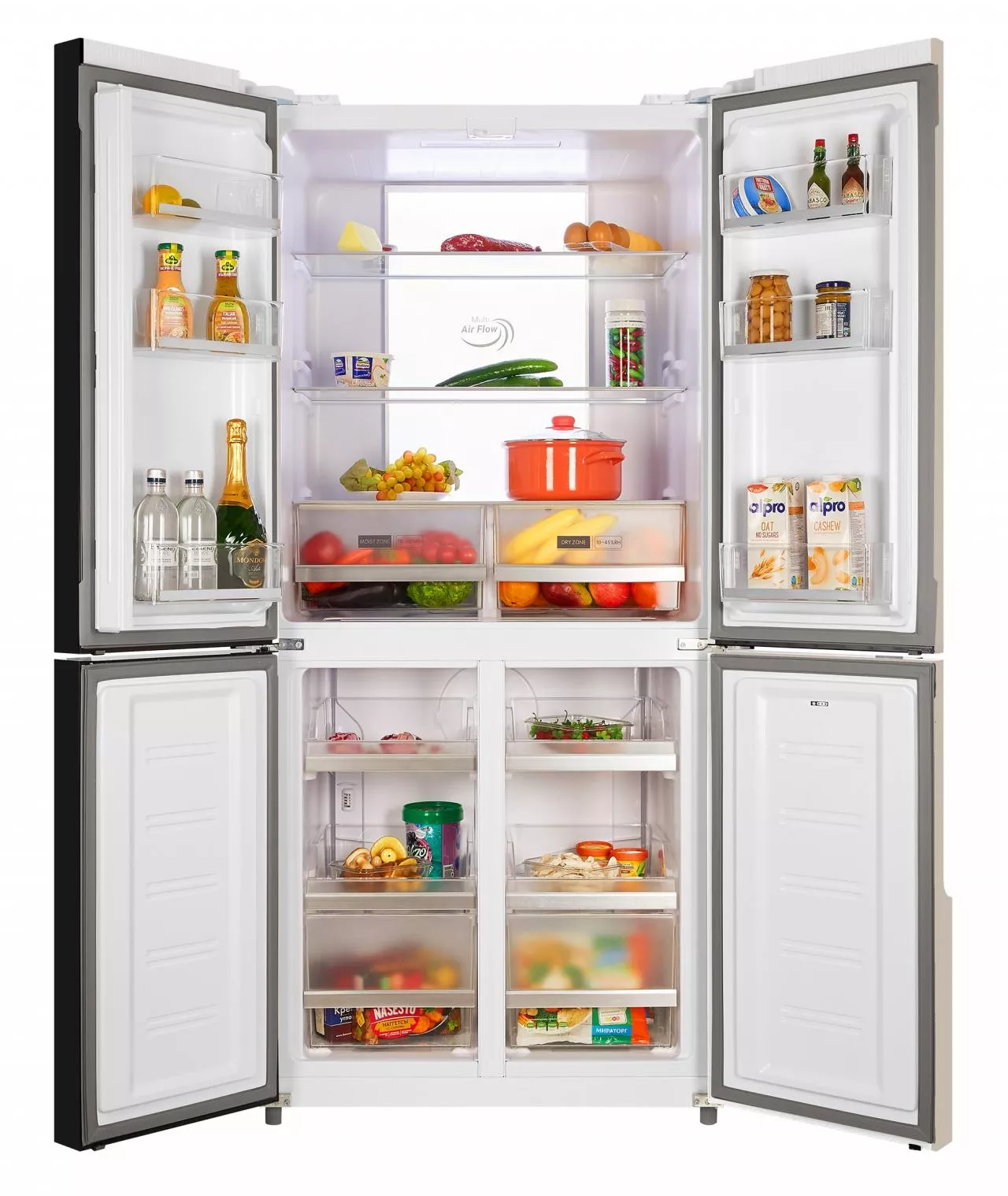 С системой Total No Frost на стенках холодильника не образовывается наледь и иней, что навсегда избавит пользователя от ручного размораживания. 4-х дверный холодильник имеет единое пространство верхних полок холодильной камеры, чтобы удобно было размещать габаритные кастрюли и контейнеры.