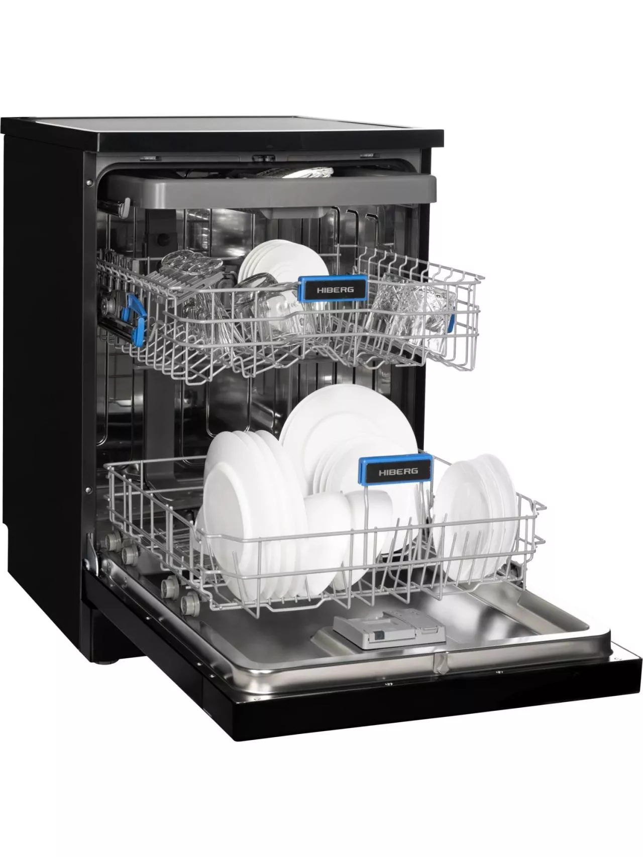 Для комфорта предусмотрены выбор зоны мытья (в одной корзине), таймер отсрочки, цветная сенсорная панель с большим дисплеем. Премиальный дизайн подчеркнут стильными кожаными вставками и единой стилистикой со стиральной машиной HIBERG I-DDQ10-814 B. За безопасность отвечают полная защита от протечек AquaStop и блокировка от детей. Гарантия — 2 года.