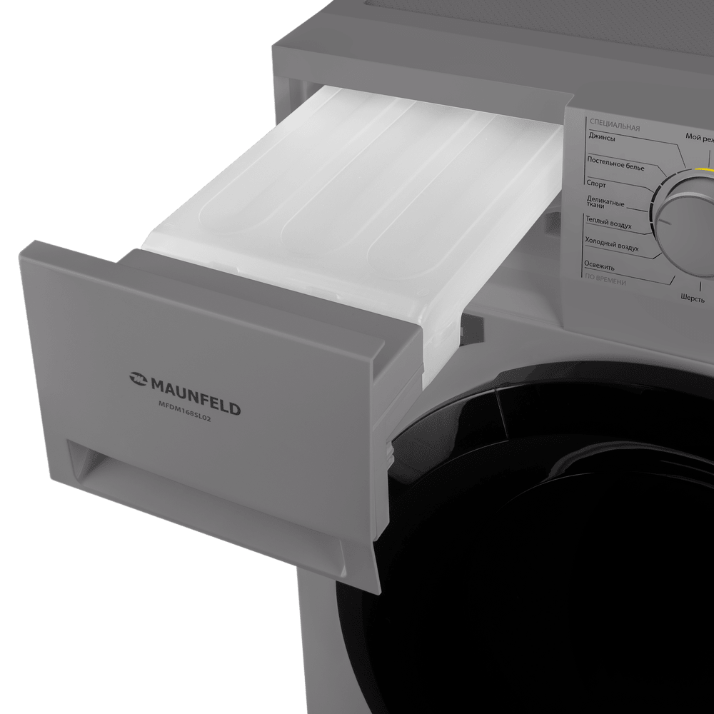 Сушильная машина с тепловым насосом MAUNFELD MFDM168SL02 экономит энергию за счёт рециркуляции тепла и бережно сушит бельё при щадящих 50–60°C. Это решение не требует вентиляции или слива — работает автономно в любом помещении, оставаясь удобным и универсальным в установке.