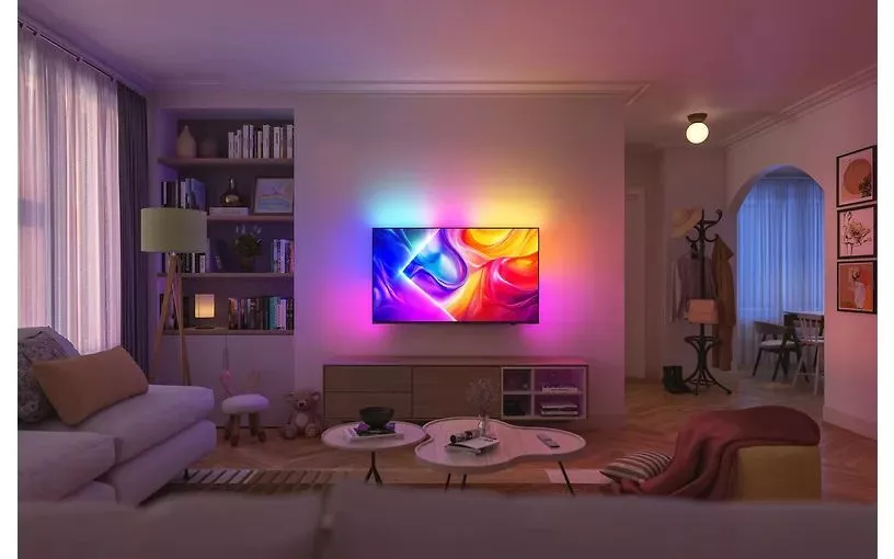 Система обработки изображения Philips P5 и экран 4K QLED обеспечивают кристально чёткую картинку с насыщенными цветами. Благодаря технологиям Dolby Vision и Dolby Atmos каждая сцена воспроизводится с кинематографической точностью. Фирменная подсветка Ambilight усиливает эффект погружения: встроенные светодиоды реагируют на изображение и создают цветное сияние вокруг телевизора.