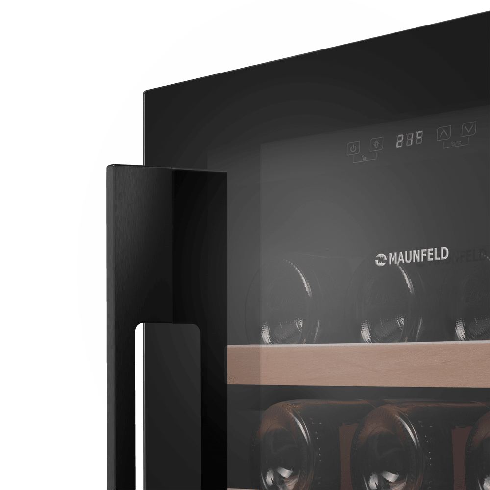 Компрессорная система с вентилятором равномерно распределяет холодный воздух, а дверца из тонированного стекла с УФ-защитой надёжно сохраняет качество вина. Внутренняя LED-подсветка делает коллекцию стильной и заметной.